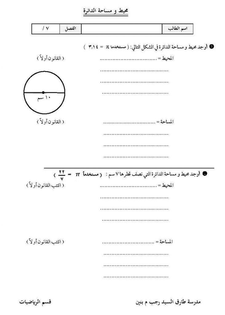 ورقة عمل محيط ومساحة الدائرة رياضيات للصف السابع مدرسة طارق السيد رجب مدرستي الكويتية