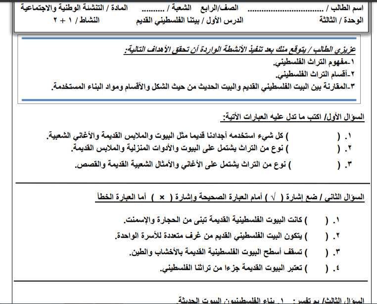 أوراق عمل في التنشئة الوطنية والاجتماعية للصف الرابع الفصل الثاني المنهاج الفلسطيني الجديد