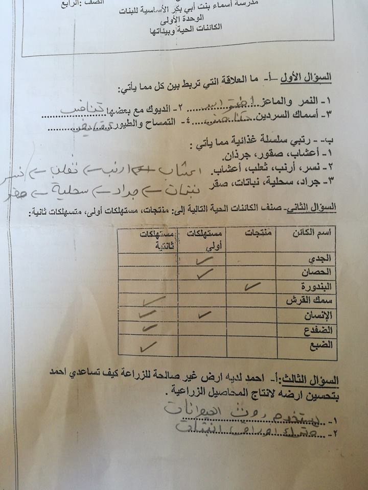 ننقل لكم ورقة عمل شاملة وحدة الكائنات الحية وبيئاتها لمادة العلوم للصف الرابع الفصل الأول منتديات صقر الجنوب