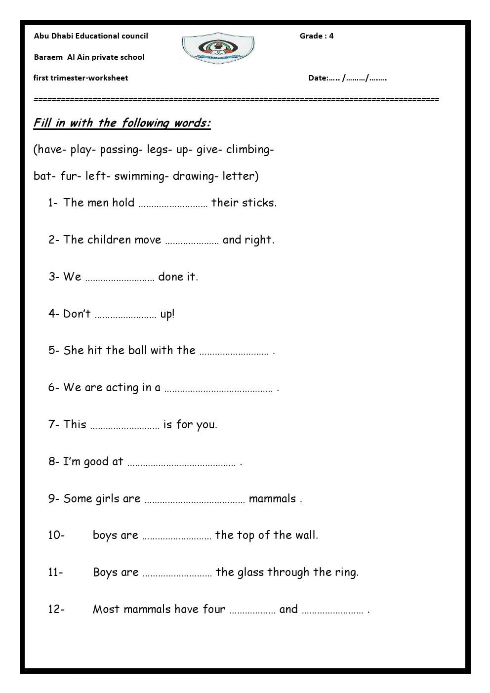أوراق عمل في مادة اللغة الانجليزية متنوعة للصف الرابع