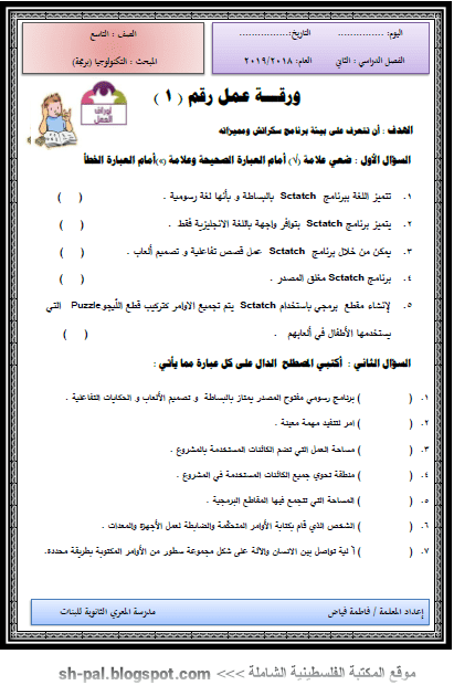 ورقة عمل في أساسيات التعامل مع سكراتش للصف التاسع الفصل الثاني المكتبة الفلسطينية الشاملة