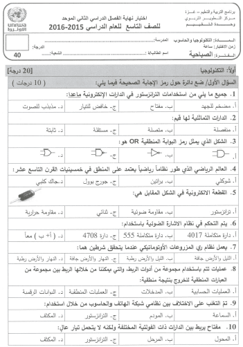 اختبار حاسوب وتكنولوجيا للصف التاسع نهاية الفصل الثاني 2016 المكتبة الفلسطينية الشاملة