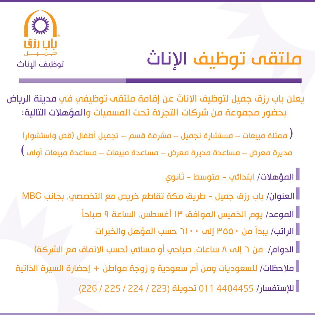 باب رزق جميل Bab Rizq Jameel On Twitter ملتقى توظيفي للسيدات في الرياض توظيف وظائف شاغرة Http T Co Jcjrnxzyxn