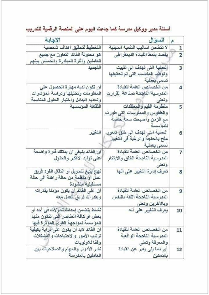 احدث اسئلة واجابات الامتحان الفعلى لدورة القيادة التربوية مدير ووكيل ادارة تعليمية