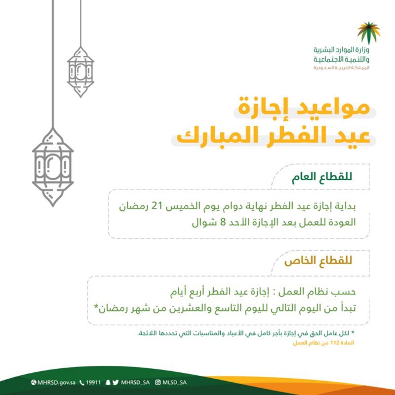 محافظة رماح On Twitter مواعيد اجازة عيد الفطر المبارك بداية الإجازة نهاية دوام الخميس 21 رمضان العودة للعمل بعد الإجازة الأحد 8 شوال القطاع الخاص تكون الإجازة حسب نظام العمل